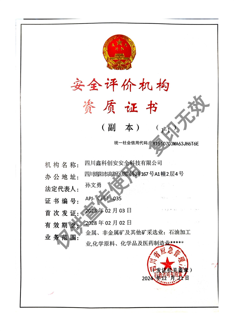 四川鑫科創(chuàng)安安全科技有限公司成立于2020年,是川北地區取得資質的民營安全評價機構(資質證書編號:APJ-(川)-035)。并于2022年牽頭成立綜合應急救援隊伍 - 綿陽曙光應急救援中心。